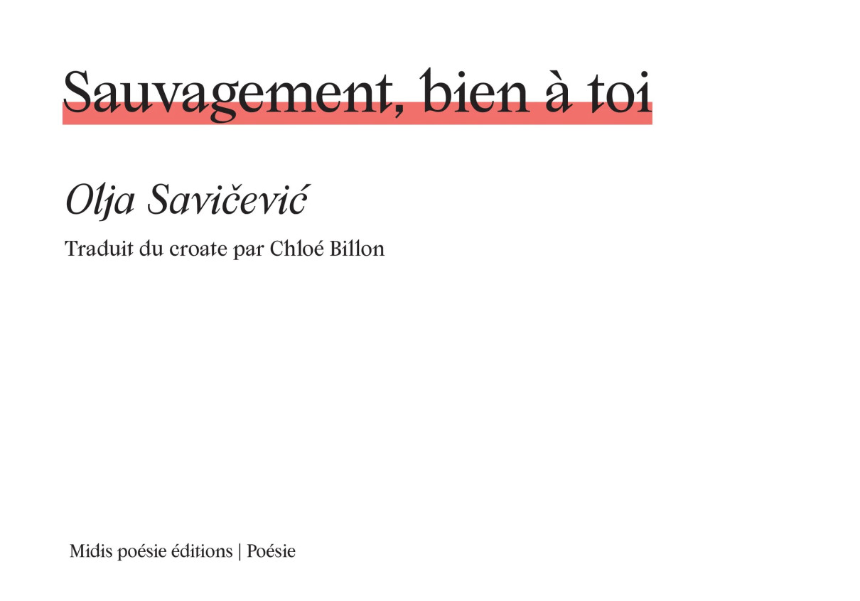 Sauvagement, bien à toi, d'Olja Savicevic (traduction Chloé Billon) Paru aux éditions des Midis poésie en septembre 2025. Plus d'infos et commande du livre via ce lien.
